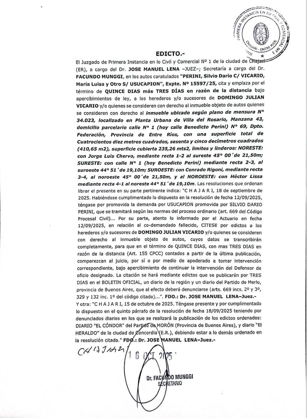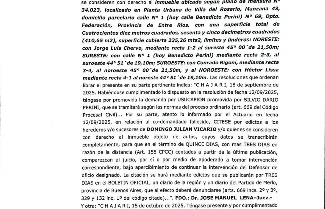 El Juzgado de Primera Instancia en lo Civil y Comercial N° 1 de la ciudad de Chajarí (ER), a cargo del Dr. JOSE MANUEL LENA – JUEZ–; Secretaría a cargo del Dr. FACUNDO MUNGGI, en los autos caratulados «PERINI, Silvio Darío C/ VICARIO, María Luisa y Otro S/ USUCAPION», Expte. N° 15597/25, cita y emplaza por el término de QUINCE DÍAS más TRES DÍAS en razón de la distancia bajo apercibimientos de ley, a los herederos y/o sucesores de DOMINGO JULIAN VICARIO y/o quienes se consideren con derecho al inmueble objeto de autos quienes se consideren con derecho al inmueble ubicado según plano de mensura N° 34.023, localizado en Planta Urbana de Villa del Rosario, Manzana 43, domicilio parcelario calle N° 1 (hoy calle Benedicto Perini) N° 69, Dpto. Federación, Provincia de Entre Ríos, con una superficie total de Cuatrocientos diez metros cuadrados, sesenta y cinco decímetros cuadrados (410,65 m2), superficie cubierta 235,26 mts2, límites y linderos: NORESTE: con Jorge Luis Chervo, mediante recta 1-2 al sureste 45°00’ de 21,50m; SURESTE: con calle N°1 (hoy Benedicto Perini) mediante recta 2-3, al suroeste 44°51’ de 19,10m; SUROESTE: con Conrado Rigoni, mediante recta 3-4, al noroeste 45°00’ de 21,50m, y al NOROESTE: con Héctor Lissa mediante recta 4-1 al noreste 44°51’ de 19,10m.