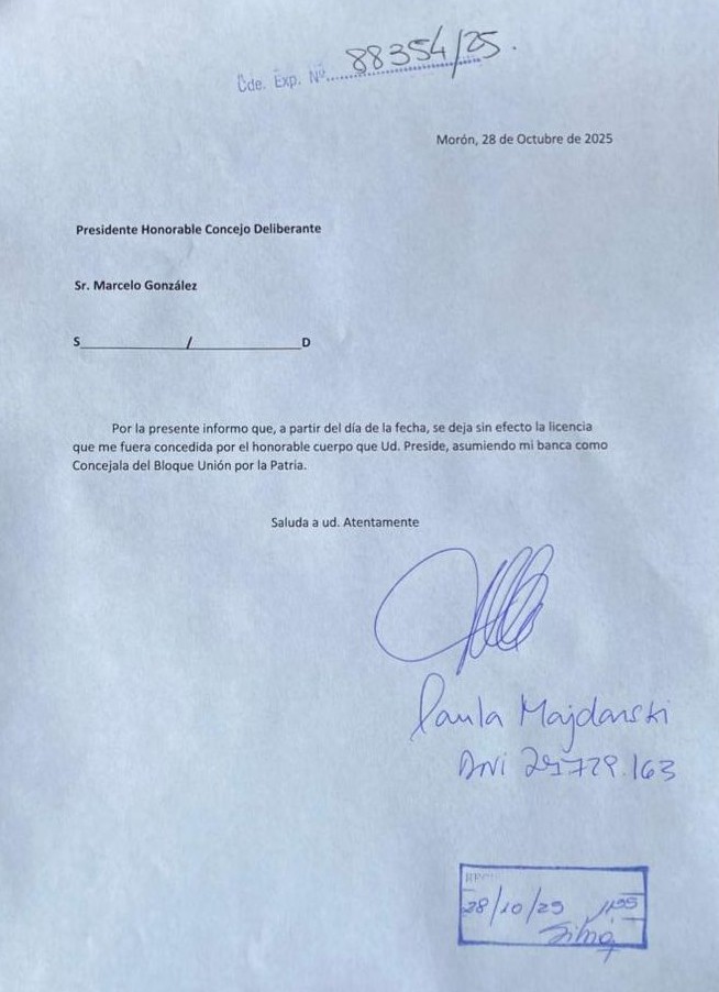 La ex secretaria de Cultura y Deporte de la Municipalidad de Morón, Paula Majdanski, ( foto ) quien había presentado su renuncia al ejecutivo el pasado jueves, acaba de asumir nuevamente en su banca de concejal en el HCD.