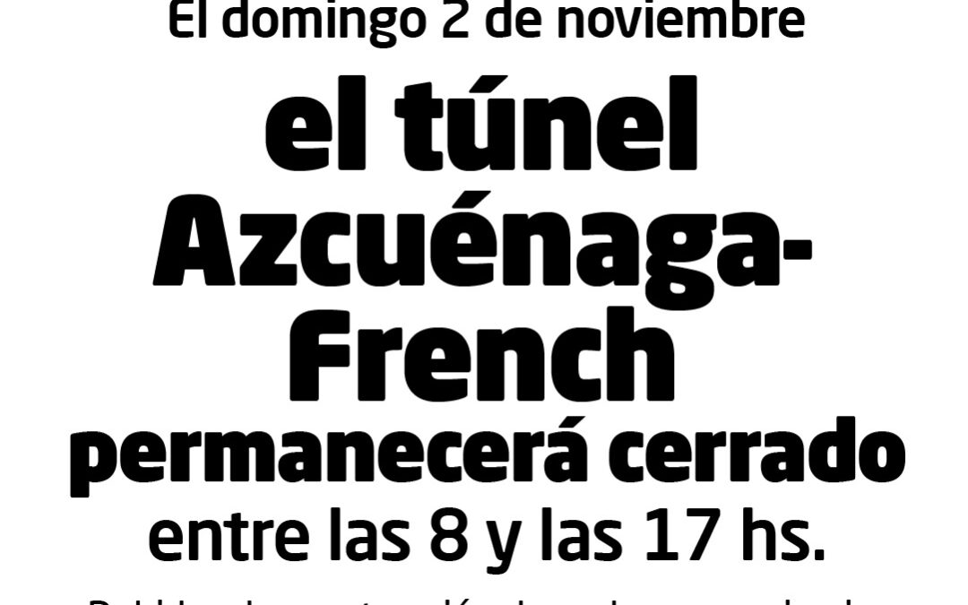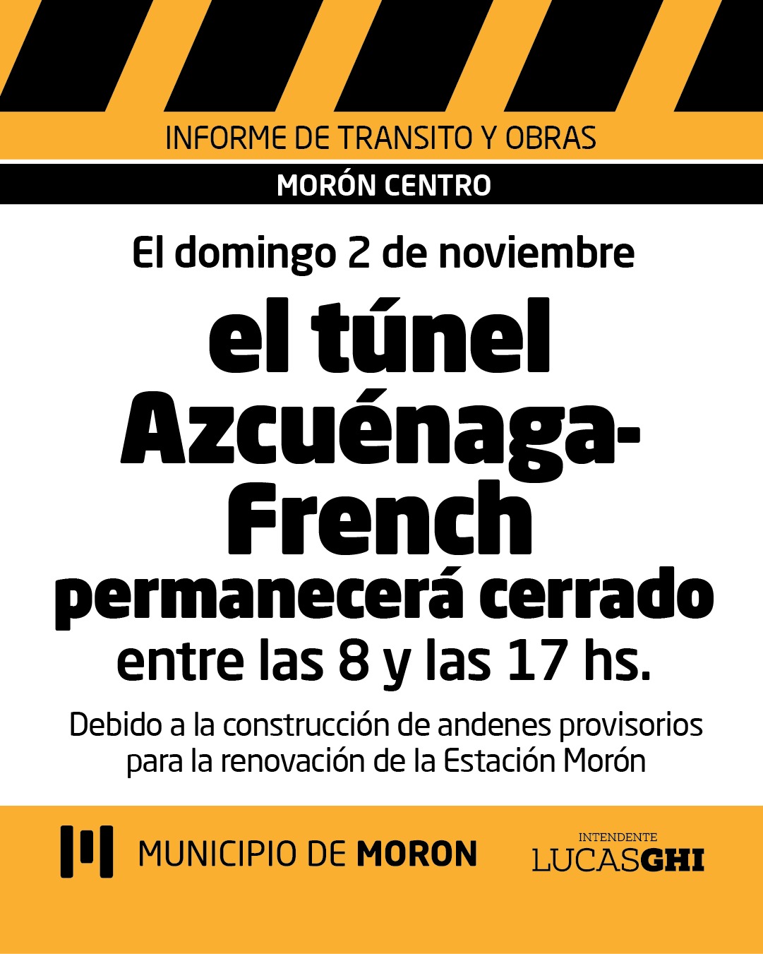 El Municipio de Morón informa que, en el marco de la obra de renovación integral de la estación Morón, el próximo domingo 2 de noviembre se realizará un corte total en el túnel Azcuénaga-French. La interrupción será tanto para el tránsito vehicular como para el peatonal, y se extenderá desde las 8 hasta las 17 hs.