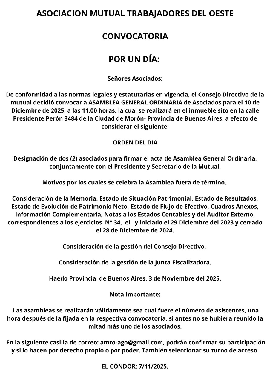 De conformidad a las normas legales y estatutarias en vigencia, el Consejo Directivo de la mutual decidió convocar a ASAMBLEA GENERAL ORDINARIA de Asociados para el 10 de Diciembre de 2025, a las 11.00 horas, la cual se realizará en el inmueble sito en la calle Presidente Perón 3484 de la Ciudad de Morón- Provincia de Buenos Aires, a efecto de considerar el siguiente: