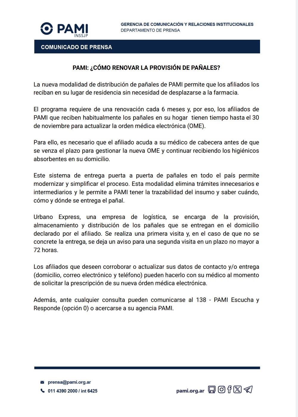 PAMI recuerda a sus afiliados que tienen tiempo hasta el próximo 30 de noviembre para gestionar la renovación de la Orden Médica Electrónica (OME) y así asegurar la continuidad en la recepción de pañales en su domicilio.