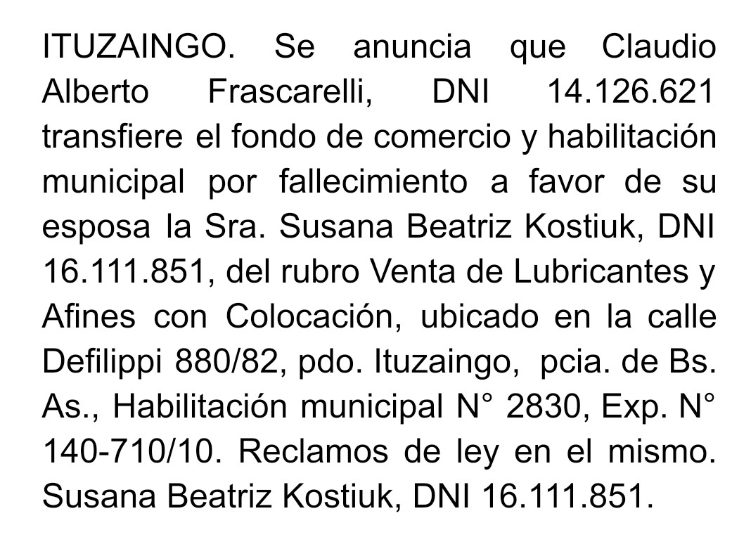 ITUZAINGO. Se anuncia que Claudio Alberto Frascarelli, DNI 14.126.621 transfiere el fondo de comercio y habilitación municipal por fallecimiento a favor de su esposa la Sra. Susana Beatriz Kostiuk, DNI 16.111.851, del rubro Venta de Lubricantes y Afines con Colocación, ubicado en la calle Defilippi 880/82, pdo. Ituzaingo, pcia. de Bs. As., Habilitación municipal N° 2830, Exp. N° 140-710/10. Reclamos de ley en el mismo. Susana Beatriz Kostiuk, DNI 16.111.851.