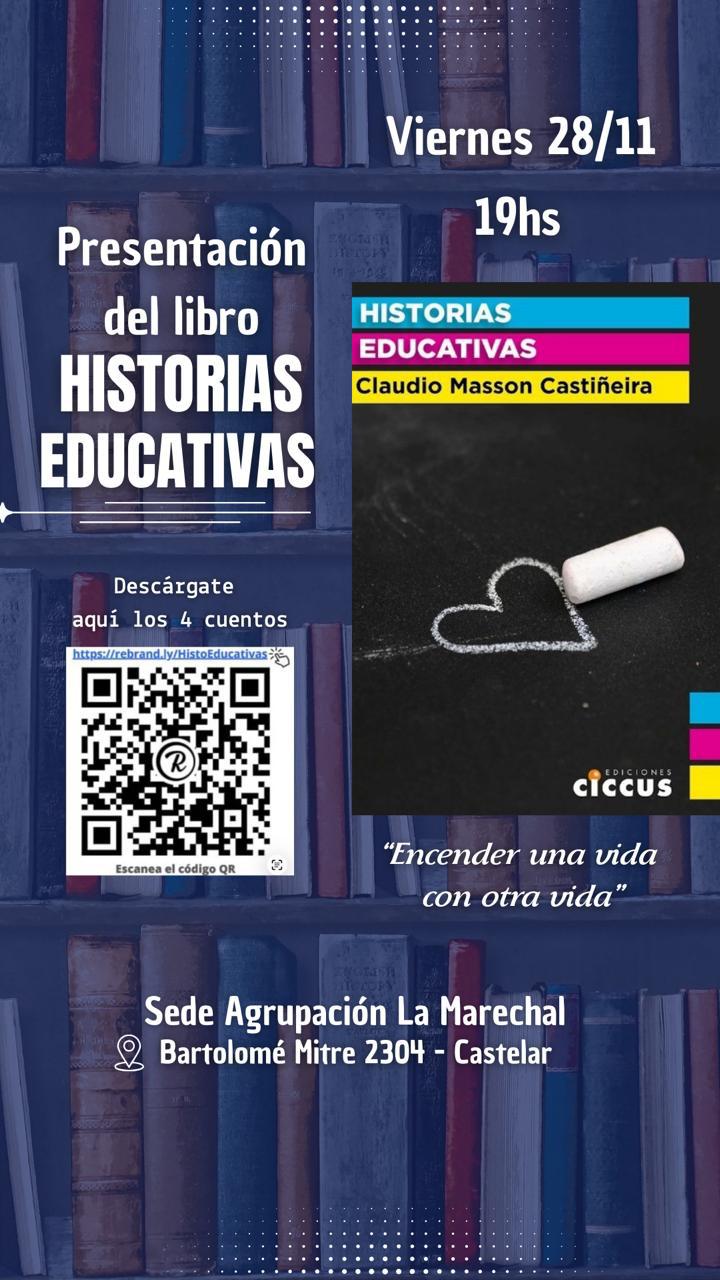 La agrupación La Marechal invita a la comunidad a la presentación del libro Historias educativas, de Claudio Masson Castiñeira, que se realizará este viernes 28 de noviembre a las 19 hs en su sede de Mitre 2304, Castelar.