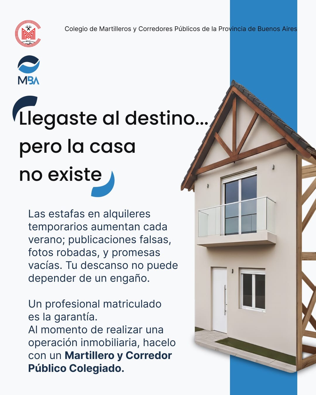 Desde la entidad remarcaron que, ante este tipo de engaños, es fundamental realizar las operaciones inmobiliarias exclusivamente a través de profesionales matriculados. “Tu descanso no puede depender de un engaño”, señalan, y recuerdan que el Martillero y Corredor Público Colegiado es la única figura habilitada por ley para garantizar una contratación segura y transparente.