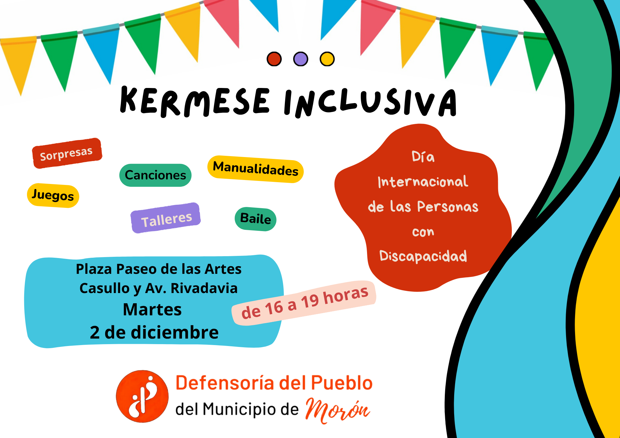 La Defensoría del Pueblo de Morón realizará una kermese inclusiva en el marco del Día Internacional de las Personas con Discapacidad. La actividad tendrá lugar el martes 2 de diciembre, de 16 a 19, en la Plaza Paseo de las Artes, ubicada en Casullo y Av. Rivadavia.