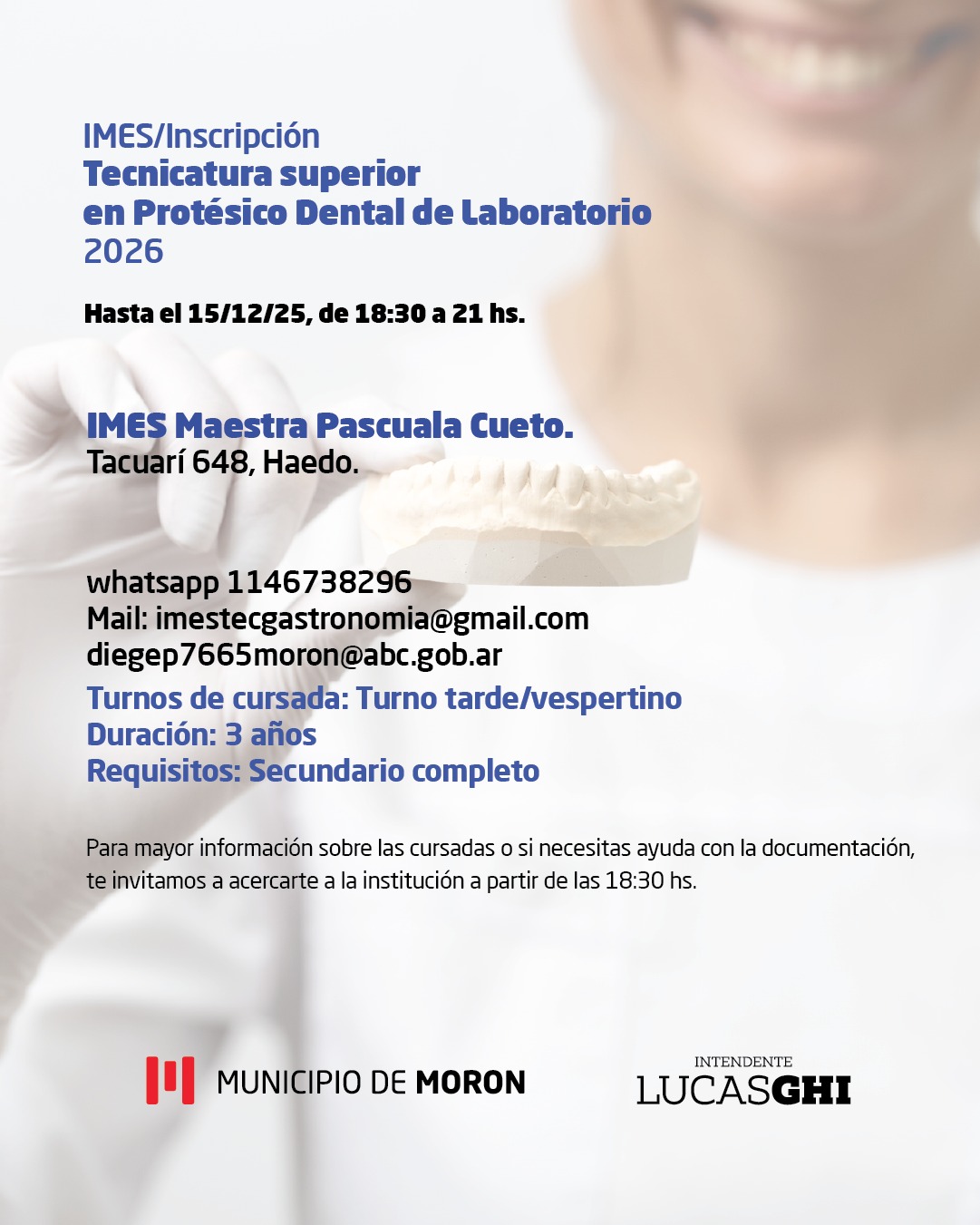 Además, también está abierta la inscripción para la Tecnicatura Superior en Protésico Dental de Laboratorio, que se desarrollará durante el ciclo 2026. Al igual que el resto de las propuestas, la inscripción es presencial en el IMES hasta el 15 de diciembre en el horario indicado.