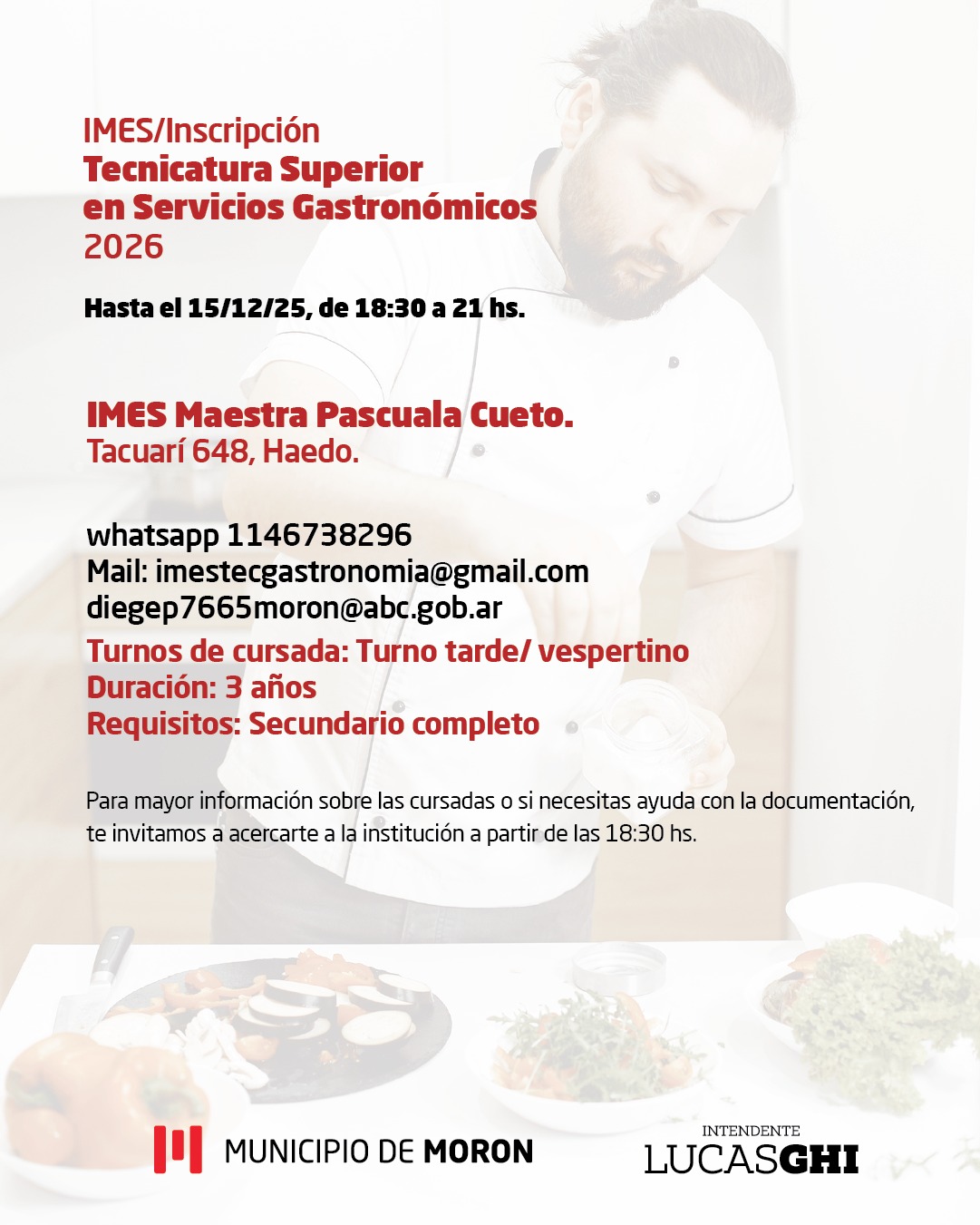 Para consultas o asistencia con la documentación requerida, las y los interesados pueden acercarse a la institución correspondiente a partir de las 18:30 hs, o comunicarse a través de WhatsApp al 1146738296 o por correo electrónico a al mail imestecgastronomia@gmail.com y diegpe7665moron@abc.gob.ar