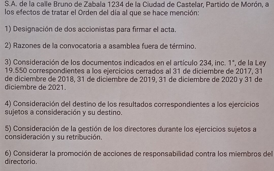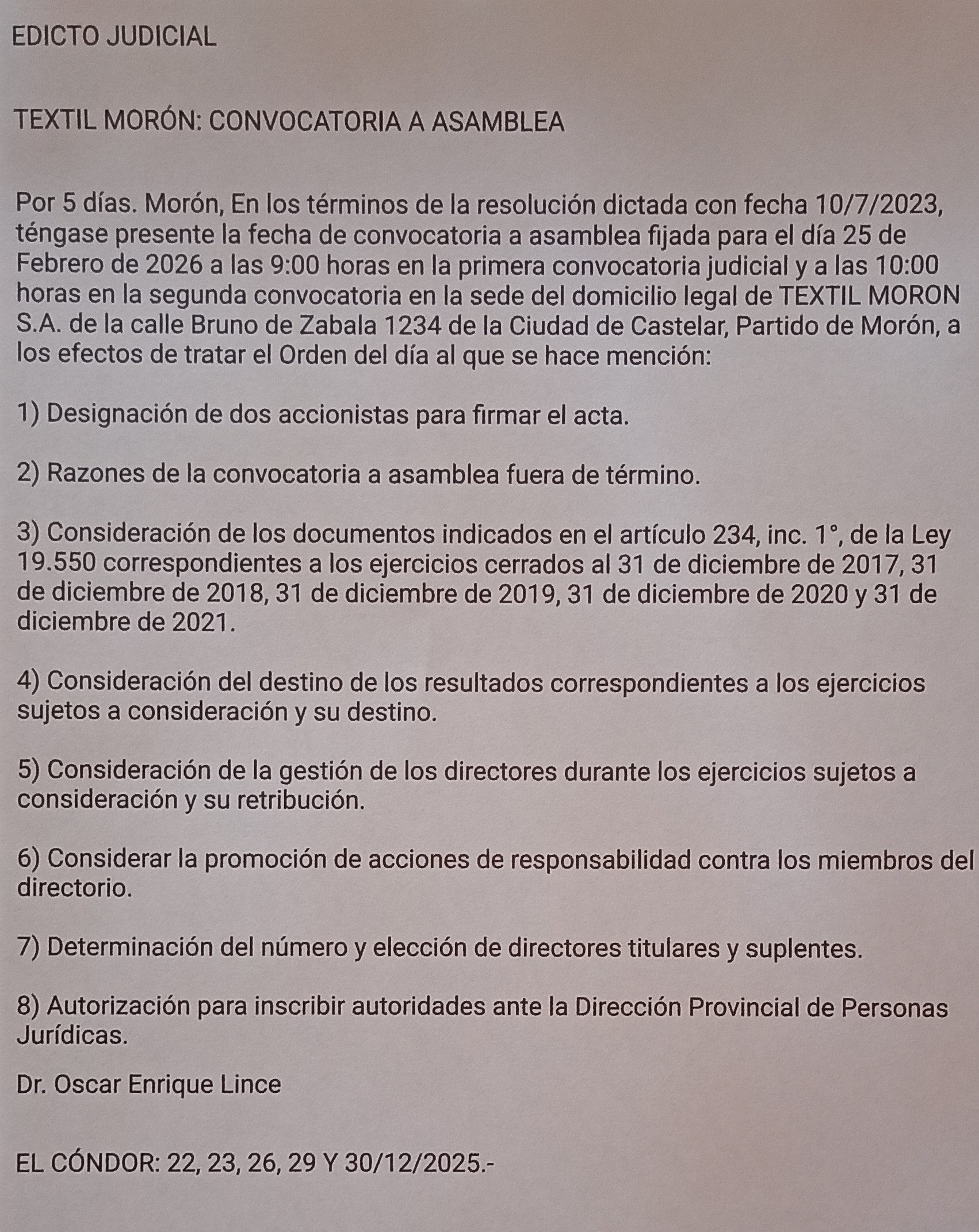 Por 5 días. Morón, En los términos de la resolución dictada con fecha 10/7/2023, téngase presente la fecha de convocatoria a asamblea fijada para el día 25 de Febrero de 2026 a las 9:00 horas en la primera convocatoria judicial y a las 10:00 horas en la segunda convocatoria en la sede del domicilio legal de TEXTIL MORON S.A. de la calle Bruno de Zabala 1234 de la Ciudad de Castelar, Partido de Morón, a los efectos de tratar el Orden del día al que se hace mención: