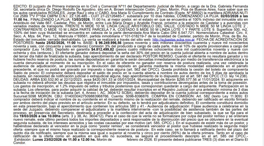NUTI Col 2589 TºV Fº164 CMPM D.N.I: 22.126.485 – CUIT 27-22126485-7, subastará por 10 días hábiles, COMENZANDO LA PUJA: 02/03/2026 a las 11.00 hs., FINALIZANDO LA PUJA: 13/03/2026, 11:00 hs. al mejor postor, en el estado en que se encuentra el 100% indiviso del inmueble sito en Aristóbulo del Valle 667, Castelar, Pdo. de Morón, entre Luis María Drago y Anatolle France, próximo a la estación de Castelar y a avenidas con variados medios de transporte. FRENTE N MIDE 10 M, LINDA CALLE ARISTOBULO DEL VALLE, COSTADO N MIDE 50 M LINDA LOTE 2 , CONTRAFRENTE O MIDE 10 M LINDA PARTE PARCELA 7 A, COSTADO S MIDE 50 M LINDA LOTE 1 Y PARTE LOTE 9. Superficie 500 m2,