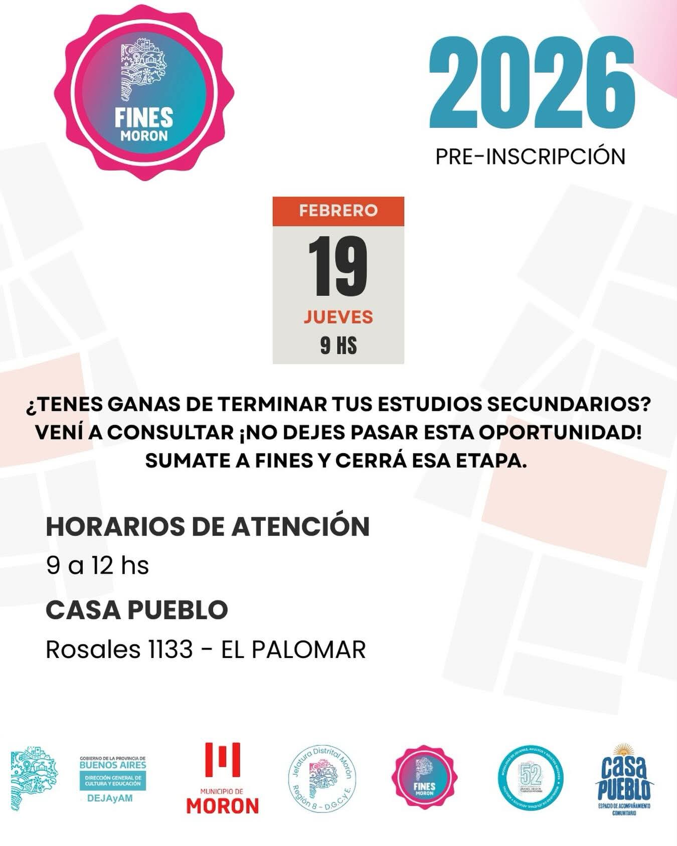 El Jueves 19 de Febrero a las 9 hs en CASA PUEBLO DE EL PALOMAR se estará llevando a cabo la inscripción para el Programa FINeS, un programa gratuito para acceder a terminar los estudios secundarios.