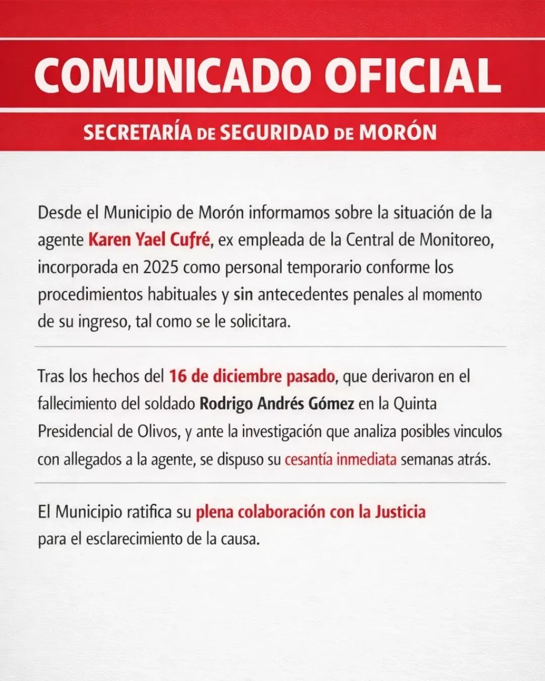 La investigación, llevada adelante de manera conjunta por el Ministerio de Seguridad Nacional y la Justicia Federal, permitió identificar a los autores intelectuales e instigadores del hecho. Según fuentes oficiales, los principales responsables son tres (3) hombres que se encontraban detenidos en las unidades penitenciarias de Magdalena y Olmos, desde donde coordinaban maniobras delictivas. A ellos se suman cuatro (4) mujeres que actuaban como colaboradoras desde el medio libre. Una de ellas, se desempeñaba como empleada del Municipio de Morón y fue cesanteada inmediatamente tras quedar involucrada en la investigación judicial. Se trata de Karen Yael Cufré, quien trabajaba en el Centro de Monitoreo de la Secretaría de Seguridad de Morón hasta su detención. Así lo informaron las autoridades locales tras un Comunicado Oficial. Cufré había sido incorporada en 2025 como personal temporario, “conforme los procedimientos habituales y sin antecedentes penales al momento de su ingreso, tal como se le solicitara”. De acuerdo al comunicado, la desvinculación se concretó semanas atrás. En el mismo texto, el Municipio de Morón aseguró que “ratifica su plena colaboración con la Justicia para el esclarecimiento de la causa”.
