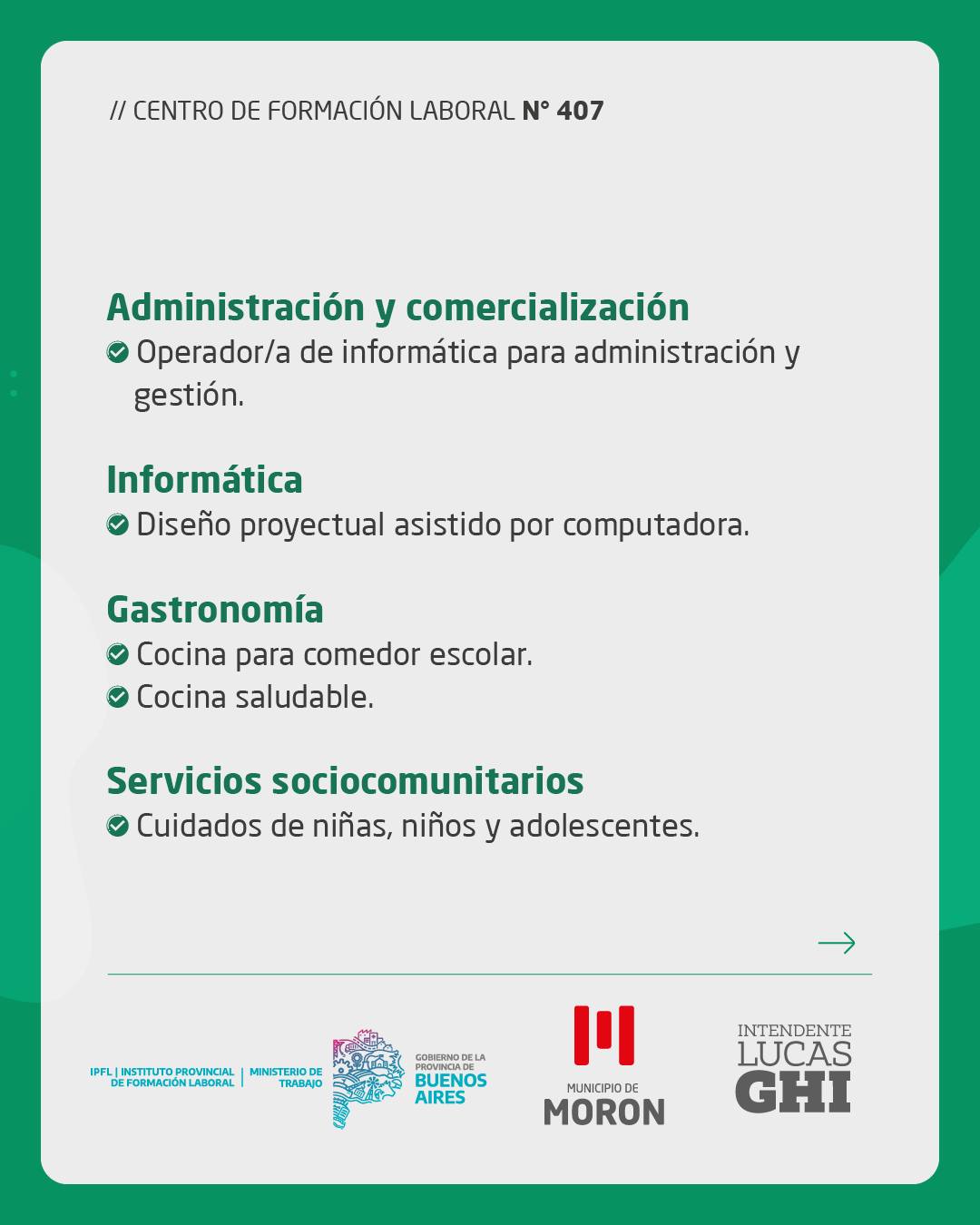 N° 407 ofrece cursos vinculados al sector textil e indumentaria, como confección de lencería, producción textil y diseño textil digital. También se dictan capacitaciones de operador/a de informática para administración y gestión, diseño proyectual asistido por computadora, cocina para comedor escolar y cuidados de niñas, niños y adolescentes, entre otras opciones.