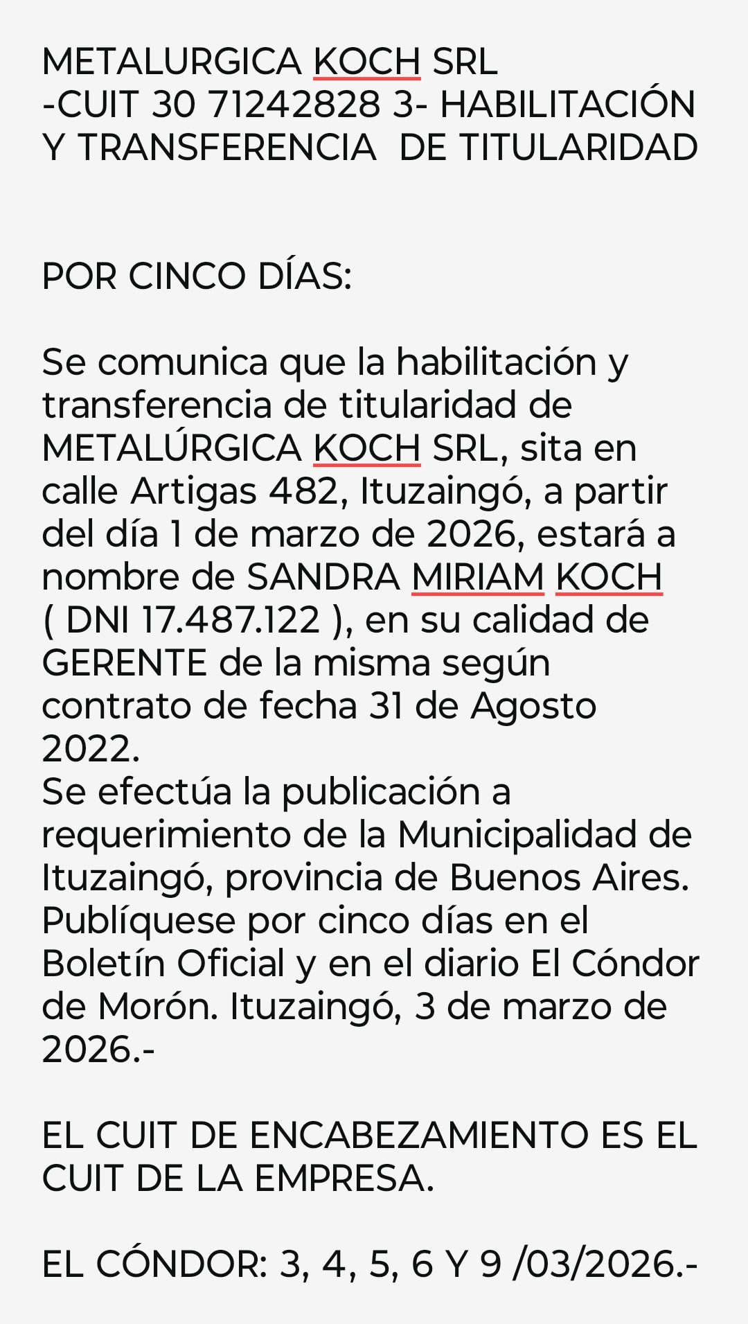 Se comunica que la habilitación y transferencia de titularidad de METALÚRGICA KOCH SRL, sita en calle Artigas 482, Ituzaingó, a partir del día 1 de marzo de 2026, estará a nombre de SANDRA MIRIAM KOCH ( DNI 17.487.122 ), en su calidad de GERENTE de la misma según contrato de fecha 31 de Agosto 2022.