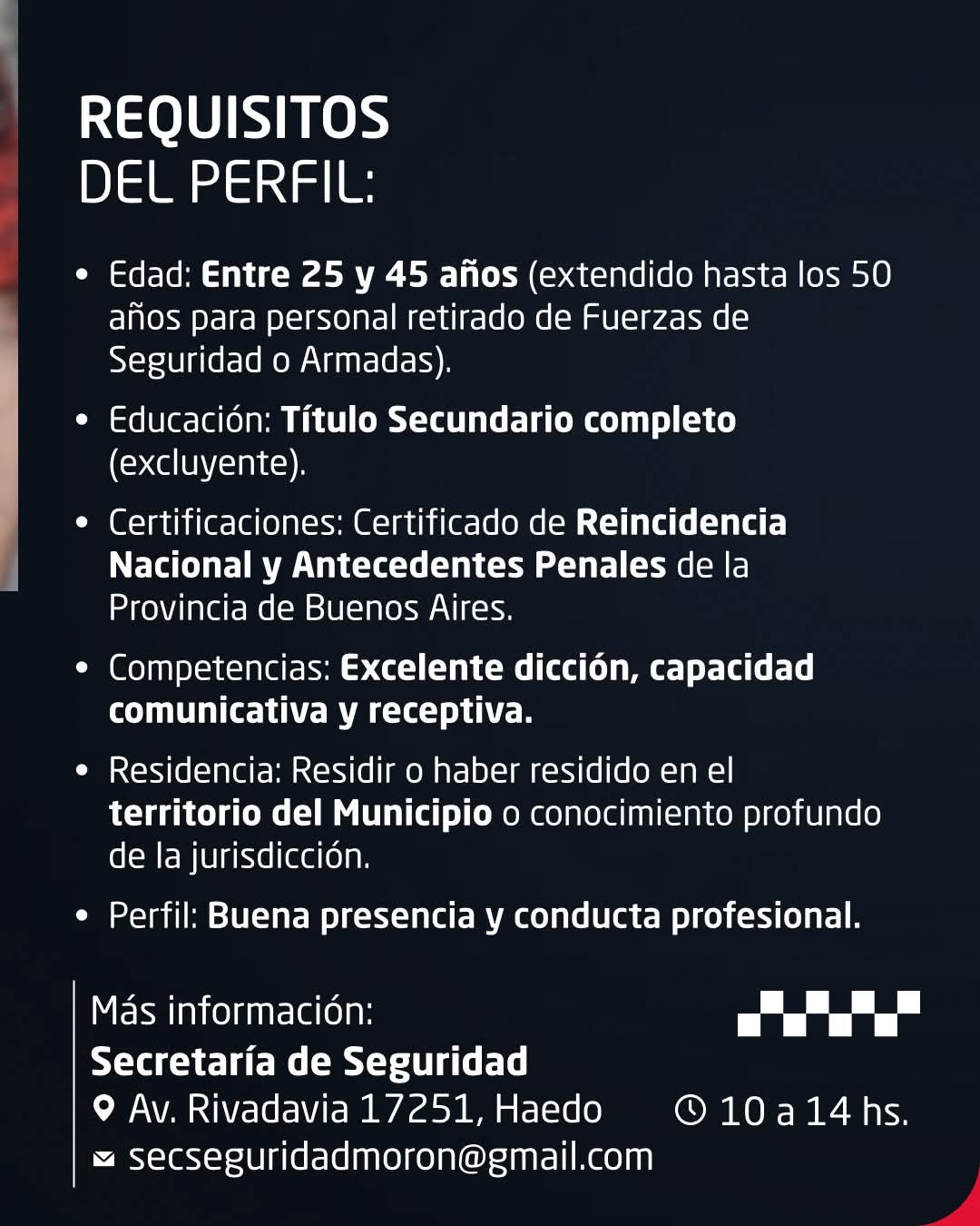 Quienes deseen postularse deberán acercarse a la Secretaría de Seguridad, ubicada en Av. Rivadavia 17251, Haedo, de 10 a 14 horas, o enviar su consulta por correo electrónico a secseguridadmoron@gmail.com.