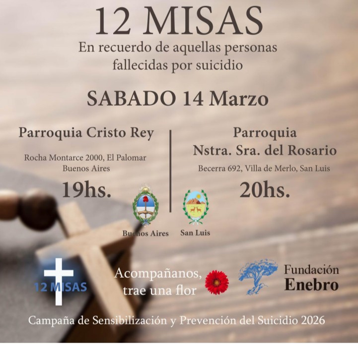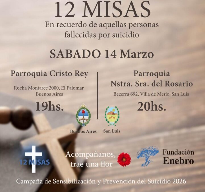 MORÓN / VILLA DE MERLO – Bajo el lema “12 Misas”, la Fundación Enebro continúa por tercer año consecutivo con su Campaña de Prevención del Suicidio en ámbitos de fe. Con el objetivo de transformar el dolor en esperanza y romper el silencio frente a una problemática que afecta a miles de familias, la iniciativa busca generar espacios de contención, reflexión y acompañamiento espiritual.