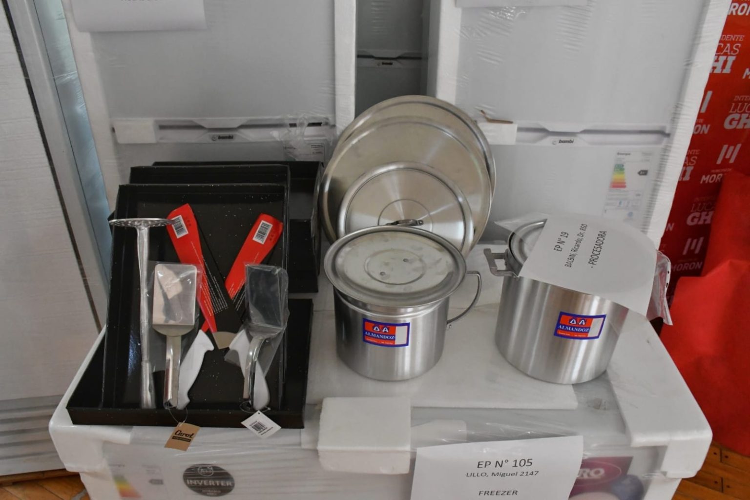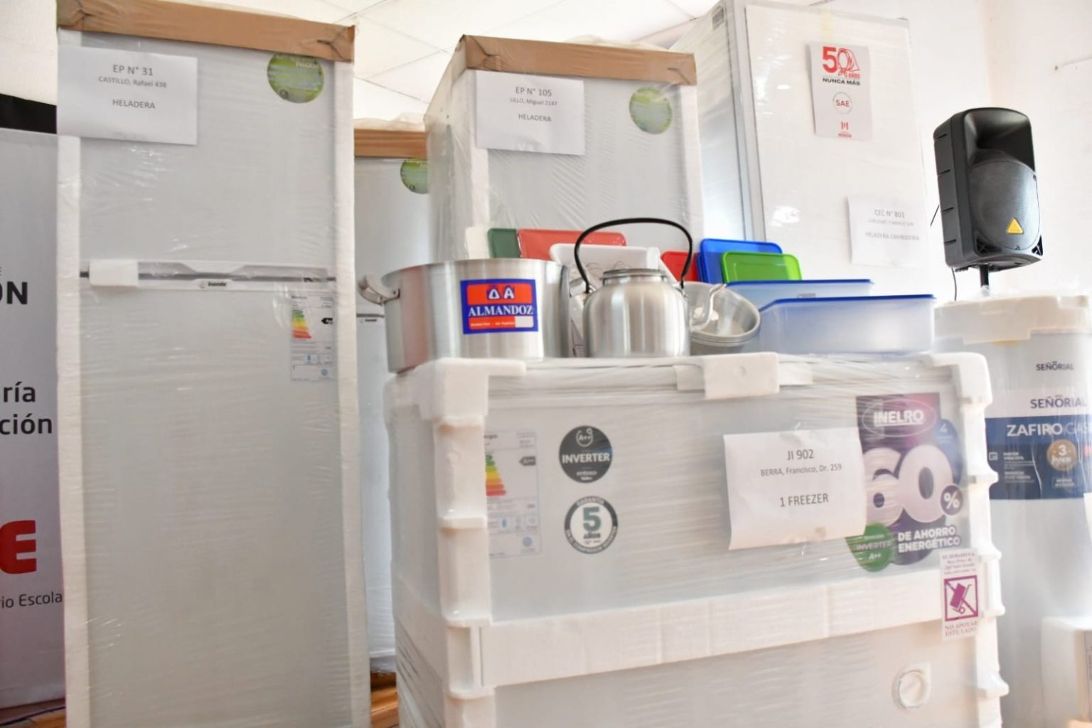 Durante la jornada se entregaron cocinas, heladeras con freezer, heladeras exhibidoras, termotanques, freezers y hornos pizzeros, además de procesadoras, batidoras y diversos utensilios de cocina y bazar. El objetivo es mejorar las condiciones en las que se elaboran los alimentos que reciben diariamente las y los estudiantes en las escuelas públicas del distrito.