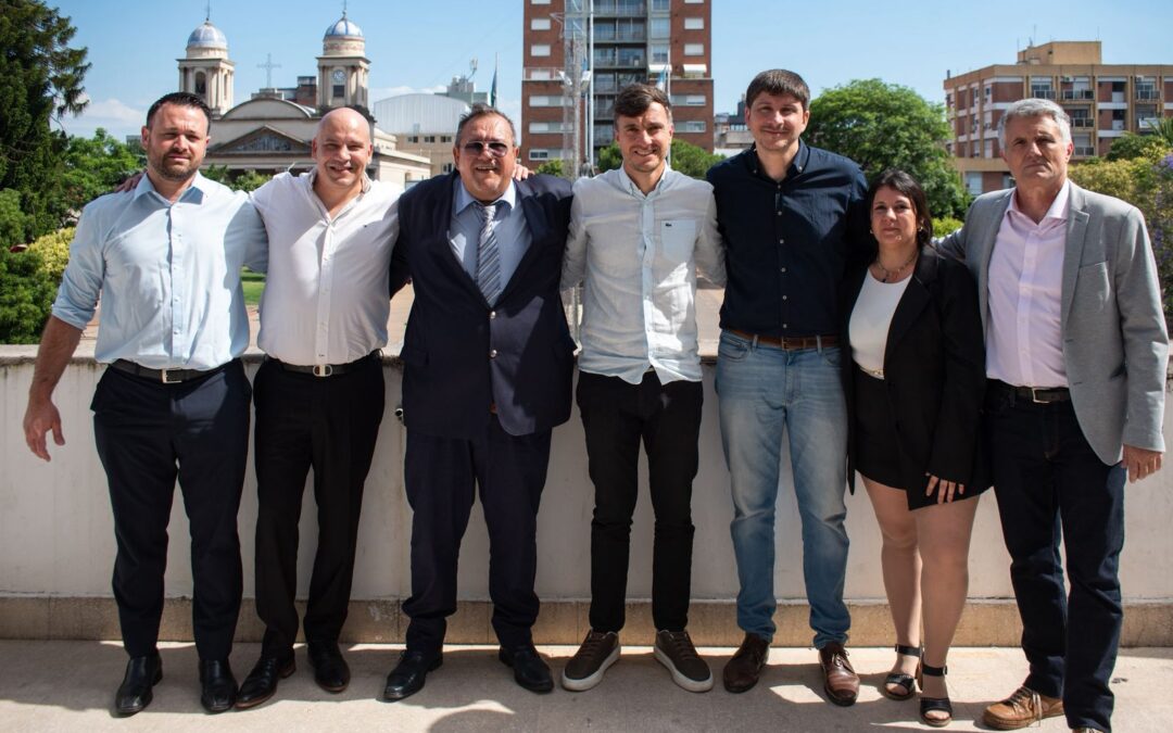 Los concejales Adrián Colonna, Alfonso Martínez, Claudio Román, presidente del PJ, el.jefe comunal Lucas Ghi, Agustín Ramponelli, Vanina Moro y José María Ghi