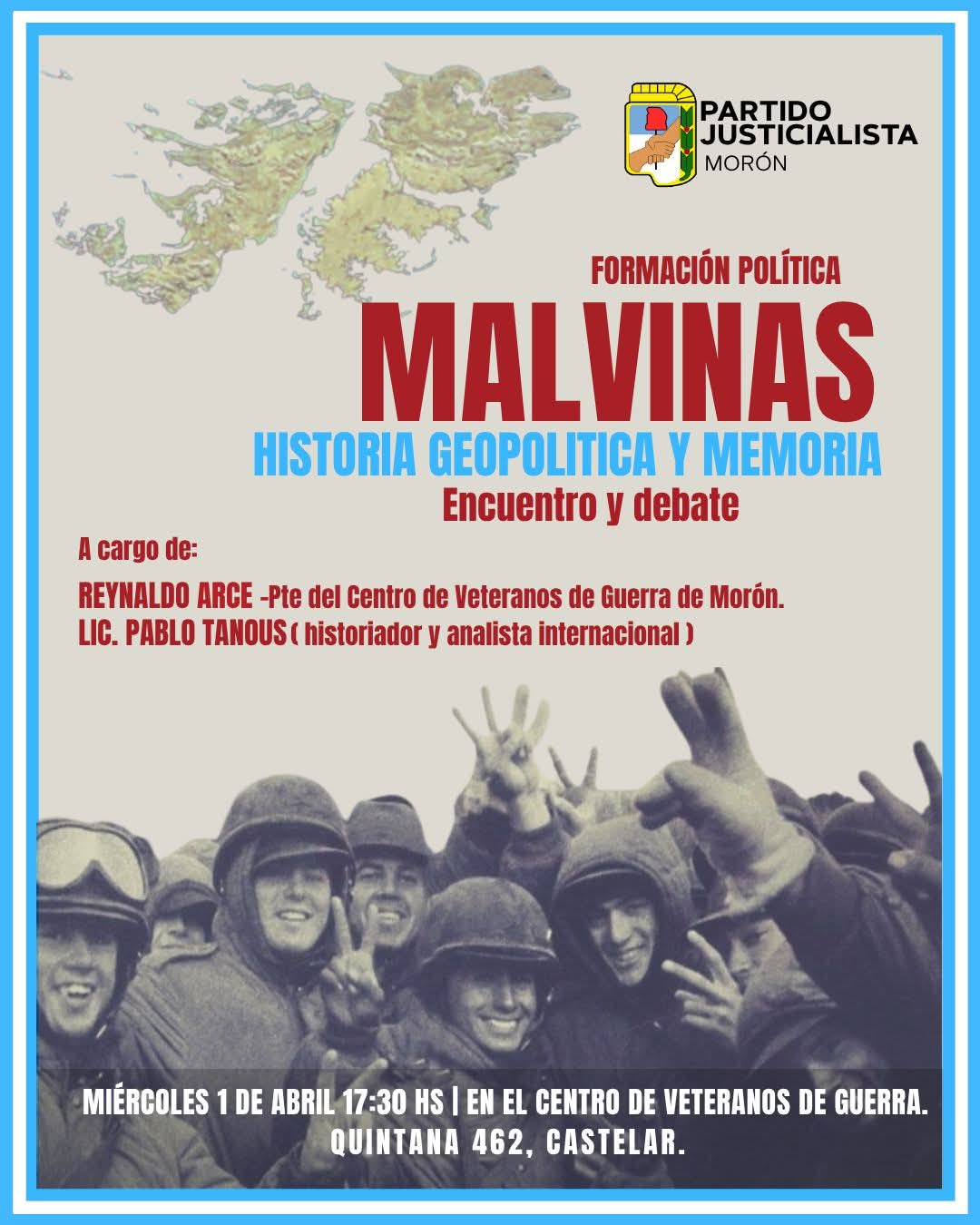 El Partido Justicialista de Morón llevará adelante un encuentro-debate titulado “Malvinas, historia geopolítica y memoria”, con el objetivo de reflexionar sobre uno de los acontecimientos más significativos de la historia argentina y su vigencia en la actualidad.