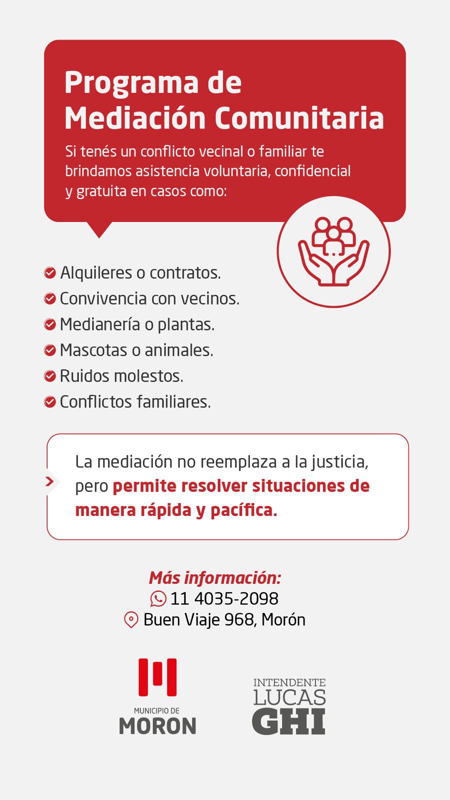 Todos estos servicios de asesoría, acompañamiento y resolución de conflictos, son absolutamente gratuitos para los vecinos y vecinas del distrito, quienes cuentan ahora con una herramienta ágil, expedita y profesional, para los diferendos que puedan suscitarse, tanto en temas de defensa del consumidor, como en materia de mediación comunitaria.