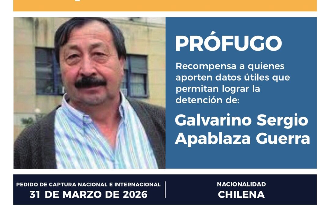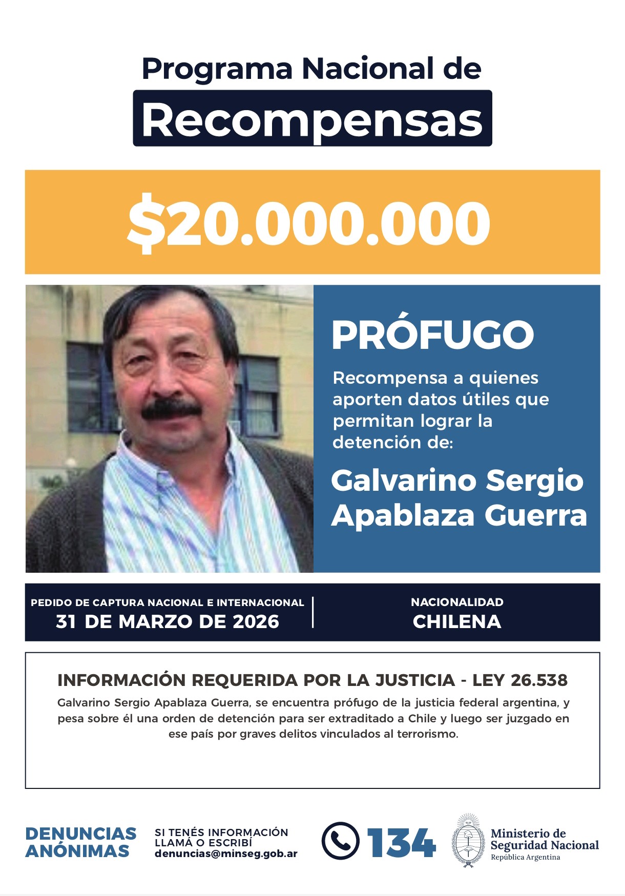 El Ministerio de Seguridad Nacional ofrece como recompensa, dentro del territorio de la República Argentina, la suma de veinte millones de pesos, destinada a aquellas personas que, sin haber intervenido en los hechos delictuales, brinden datos útiles que permitan lograr la captura de Galvarino Sergio Apablaza Guerra, sobre quien pesa orden de captura nacional e internacional desde el 31 de marzo de 2026.