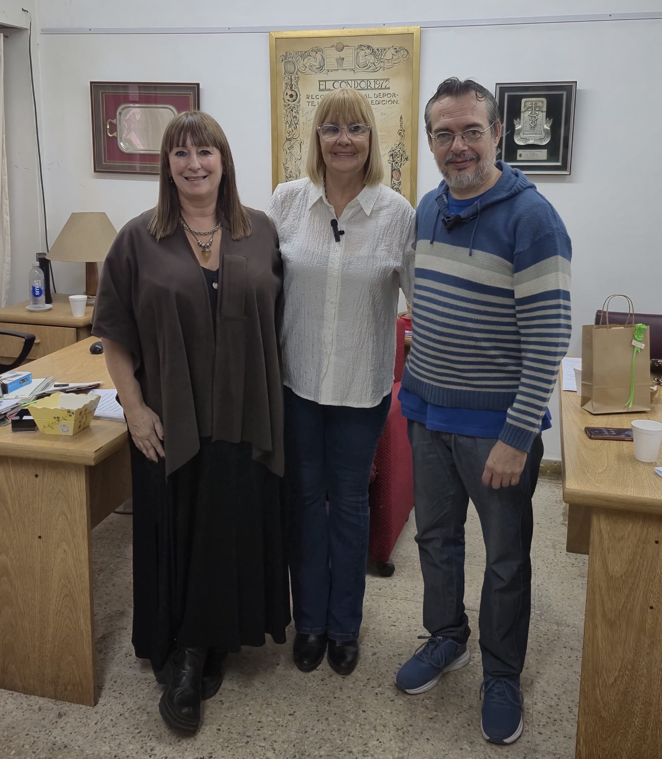 Mabel Mesa, presidenta del Consejo Escolar de Morón ( centro) junto a los periodistas Paola Mai y Gustavo Requelme