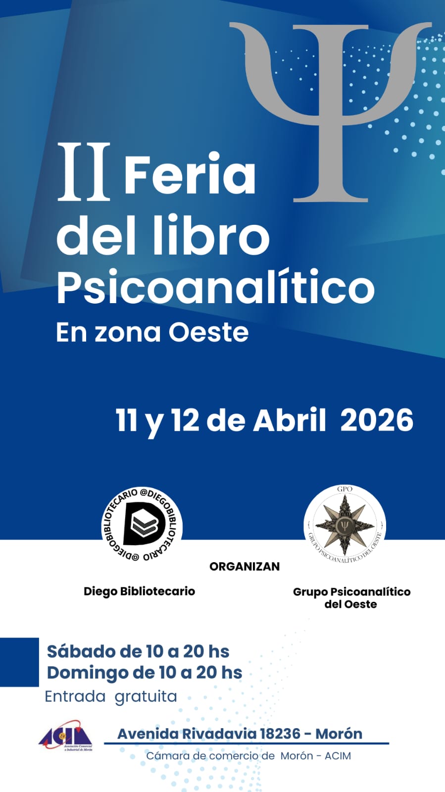 El Grupo Psicoanalítico del Oeste organiza la II Feria del Libro Psicoanalítico de Zona Oeste, que se llevará a cabo los días 11 y 12 de abril, de 10 a 20 hs, en la sede de la cámara comercial local -ACIM- Rivadavia 18236, con entrada libre y gratuita.