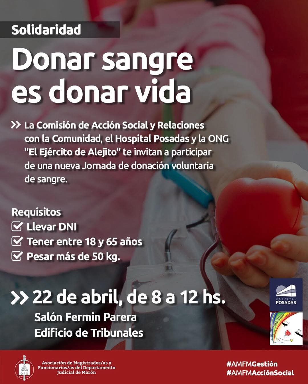 La Comisión de Acción Social y Relaciones con la Comunidad de la Asociación de Magistrados y Funcionarios Judiciales de Morón junto al Hospital Posadas y la ONG «El Ejército de Alejito», invita a la comunidad a participar de una nueva Jornada de donación voluntaria de sangre.