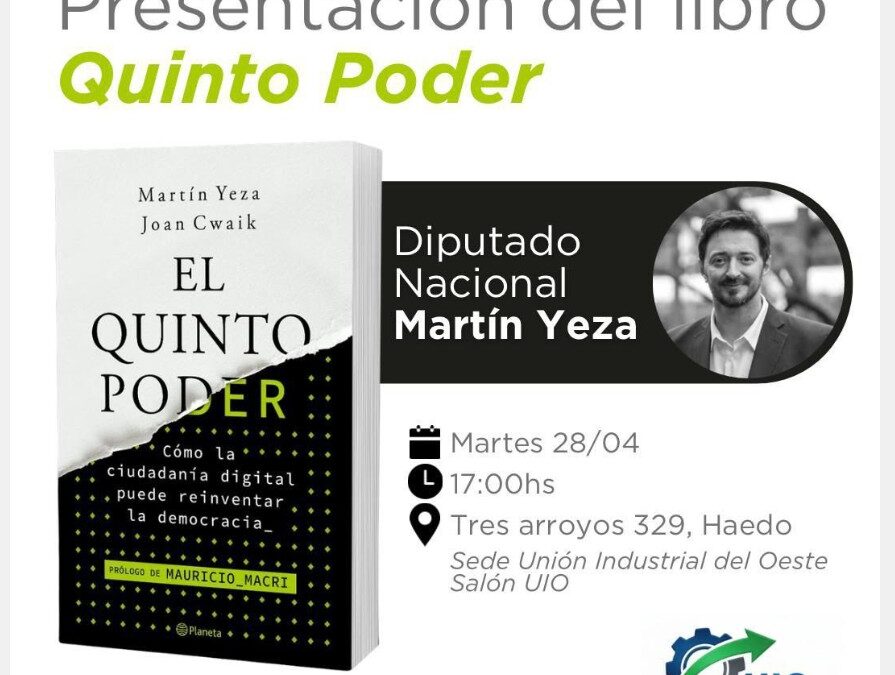 La Unión Industrial del Oeste (UIO), organismo presidido por Edgardo Gambaro, invita a la comunidad a participar de la presentación del libro “El Quinto Poder”, una obra que propone repensar el rol de la ciudadanía digital en el funcionamiento de las democracias contemporáneas.