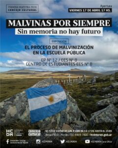 En el marco del 44° aniversario de la Gesta de Malvinas y en homenaje a nuestros veteranos y caídos, el Concejo Cultural presenta su primera exposición del año, centrada en el proceso de malvinización. La apertura se realizará hoy, viernes 17 de abril, a las 17 hs, en la Escuela Pública N°12 – EES N°8. La muestra podrá visitarse de lunes a viernes, de 9 a 17 hs, hasta el 15 de mayo.