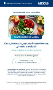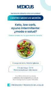 El Centro Medicus de Morón invita a la comunidad a participar de su primer seminario gratuito: “Keto, Low Carb y ayuno intermitente: ¿moda o salud?”. La jornada estará a cargo de la Lic. Natalia Iglesias y se llevará a cabo el próximo 5 de mayo a las 17:00 hs, en Almirante Brown 428, Morón.